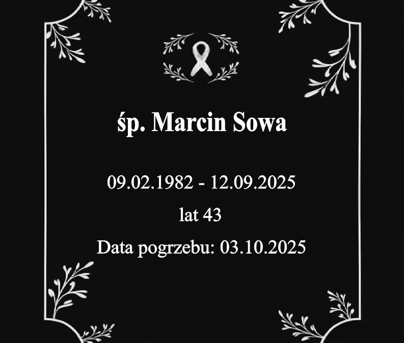 śp. Marcin Sowa utworzone przez admin_nekro-zielinski.pl | wrz 23, 2025 | NekrologiData pogrzebu: 03.10.2025 Msza Święta: 03.10.2025 o godz. 11:30 Krematorium Toruń, Grudziądzka 190/192 Wyprowadzenie do grobu o godz. 12:00 Cmentarz: Centralny Cmentarz Komunalny Toruń, ul. Grudziądzka 192 Udostępnij: Facebook Email WhatsApp CopyCopied